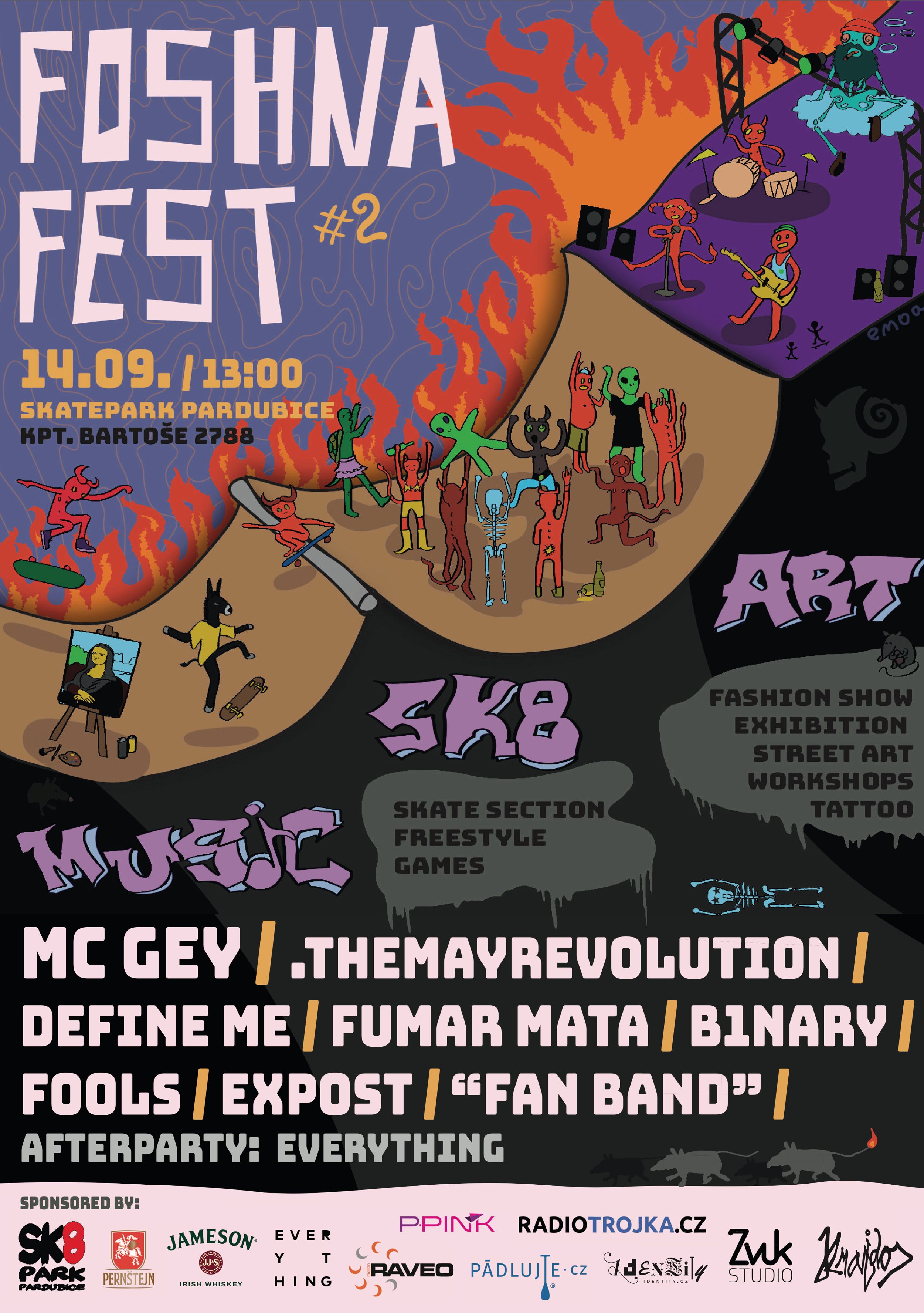 V sobotu 26. dubna 2025 ožil Skatepark Pardubice druhým ročníkem multižánrového festivalu FOSHNA FEST #2. Akce, která měla původně proběhnout už na podzim loňského roku, byla kvůli celorepublikovým záplavám odložena. Návštěvníci se tak dočkali až nyní – s ještě nabitějším programem, který propojil hudbu, skateboarding, vizuální umění a lifestyle svět komunity FOSHNA.