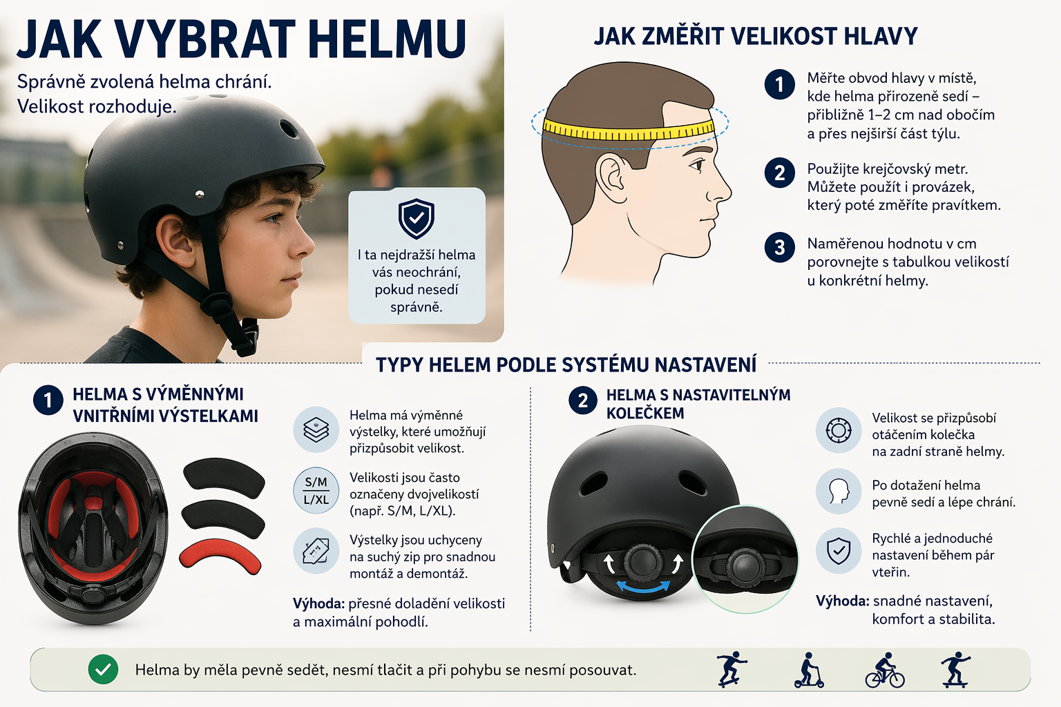 Správně zvolená helma by měla pevně sedět, nesmí tlačit a při pohybu se nesmí posouvat.